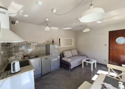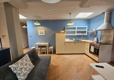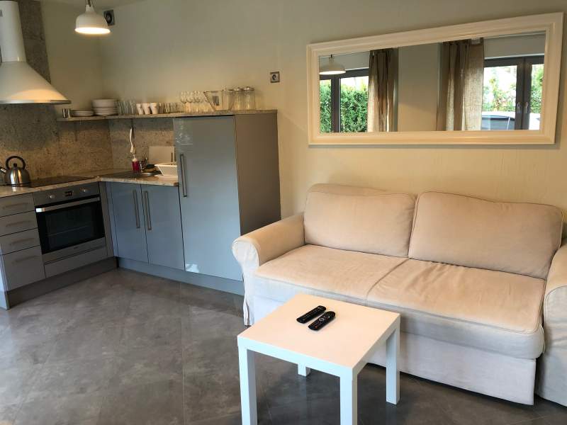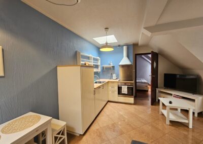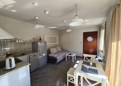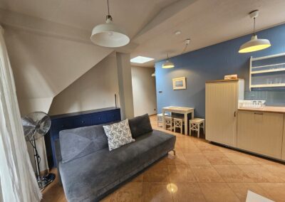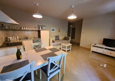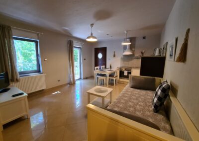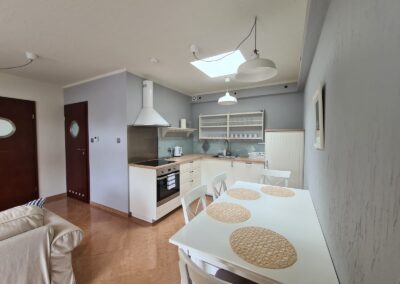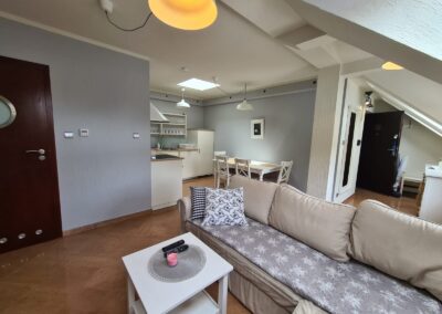 - przytulnego salonu z aneksem kuchennym: tutaj możesz zrelaksować się na wygodnej sofie, obejrzeć telewizję lub przygotować pyszne posiłki w pełni wyposażonej kuchni.