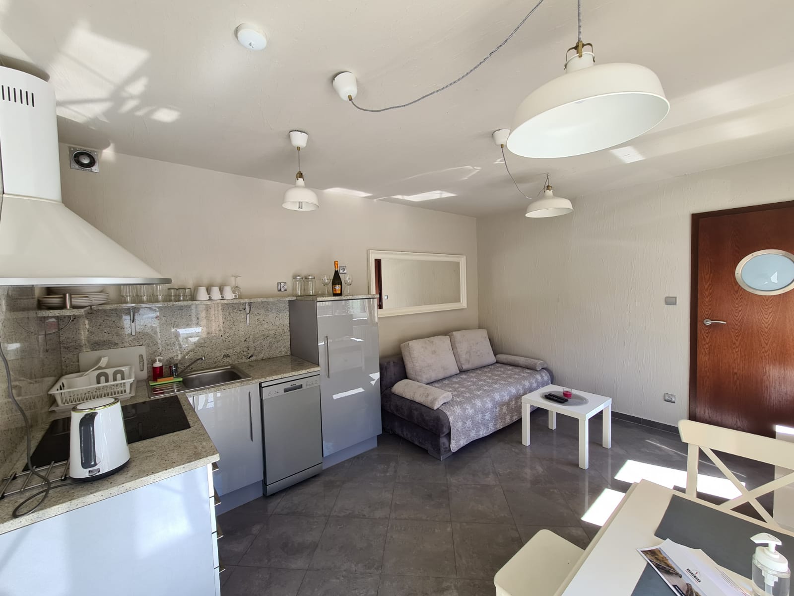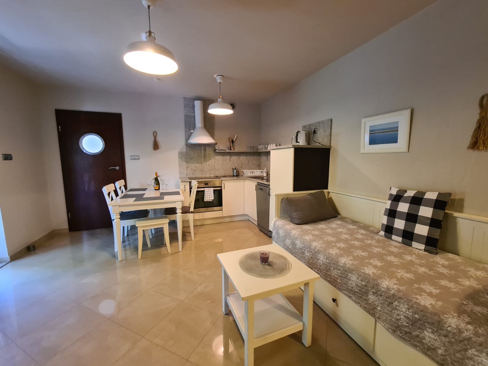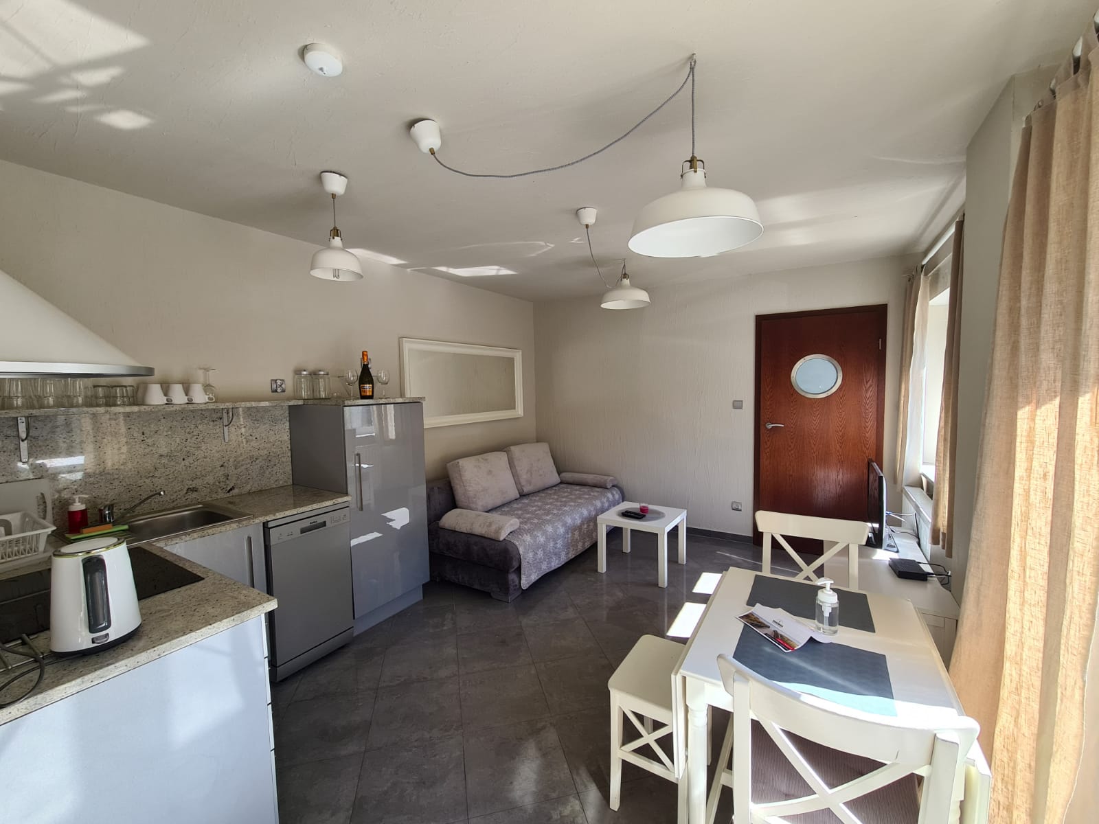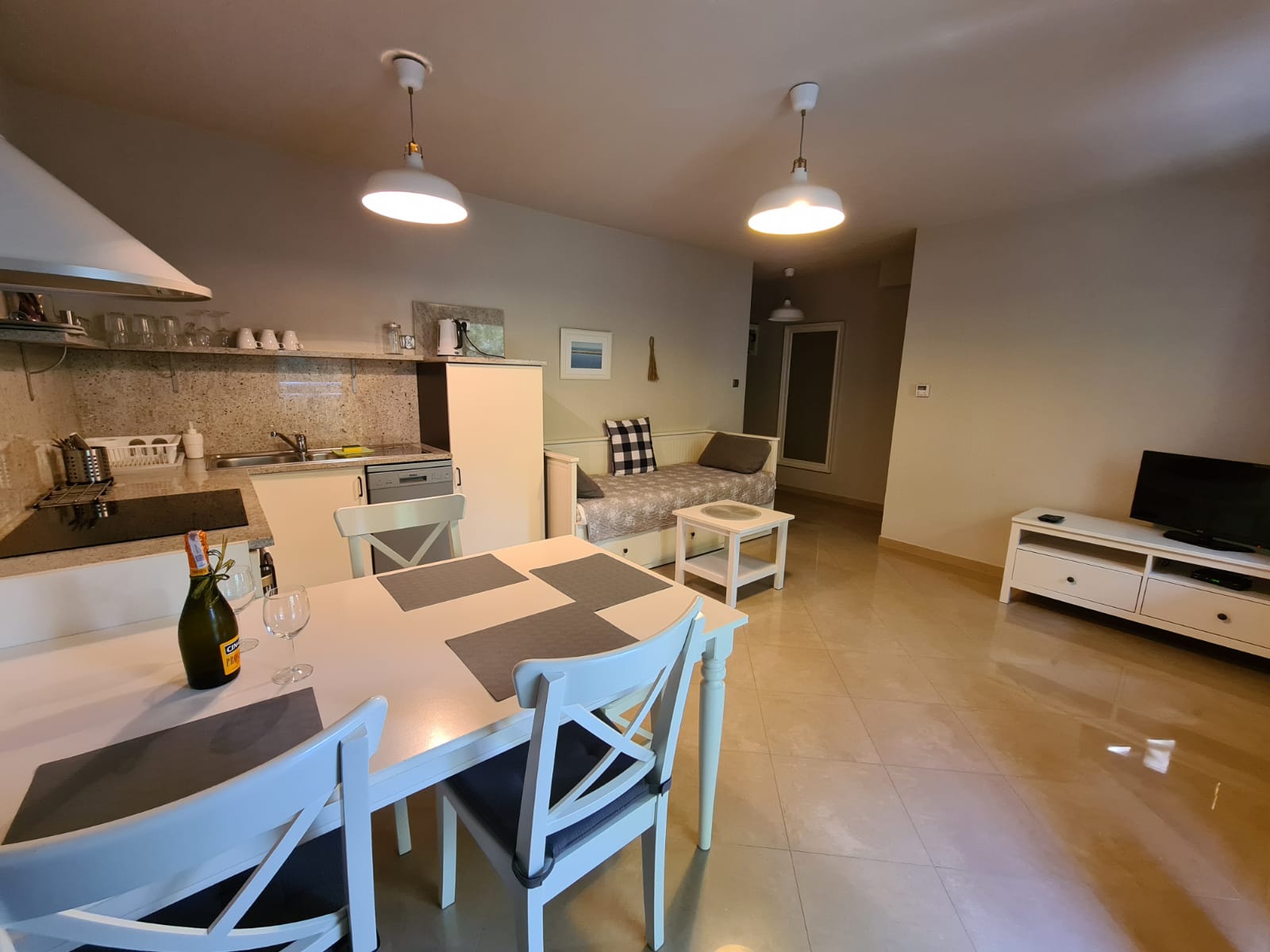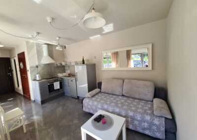- eleganckiego salonu z aneksem kuchennym: tutaj możesz wypocząć na wygodnej sofie, ciesząc się przyjemnym chłodem klimatyzacji i widokiem z balkonu, obejrzeć telewizję lub przygotować wyśmienite posiłki w nowoczesnej kuchni.