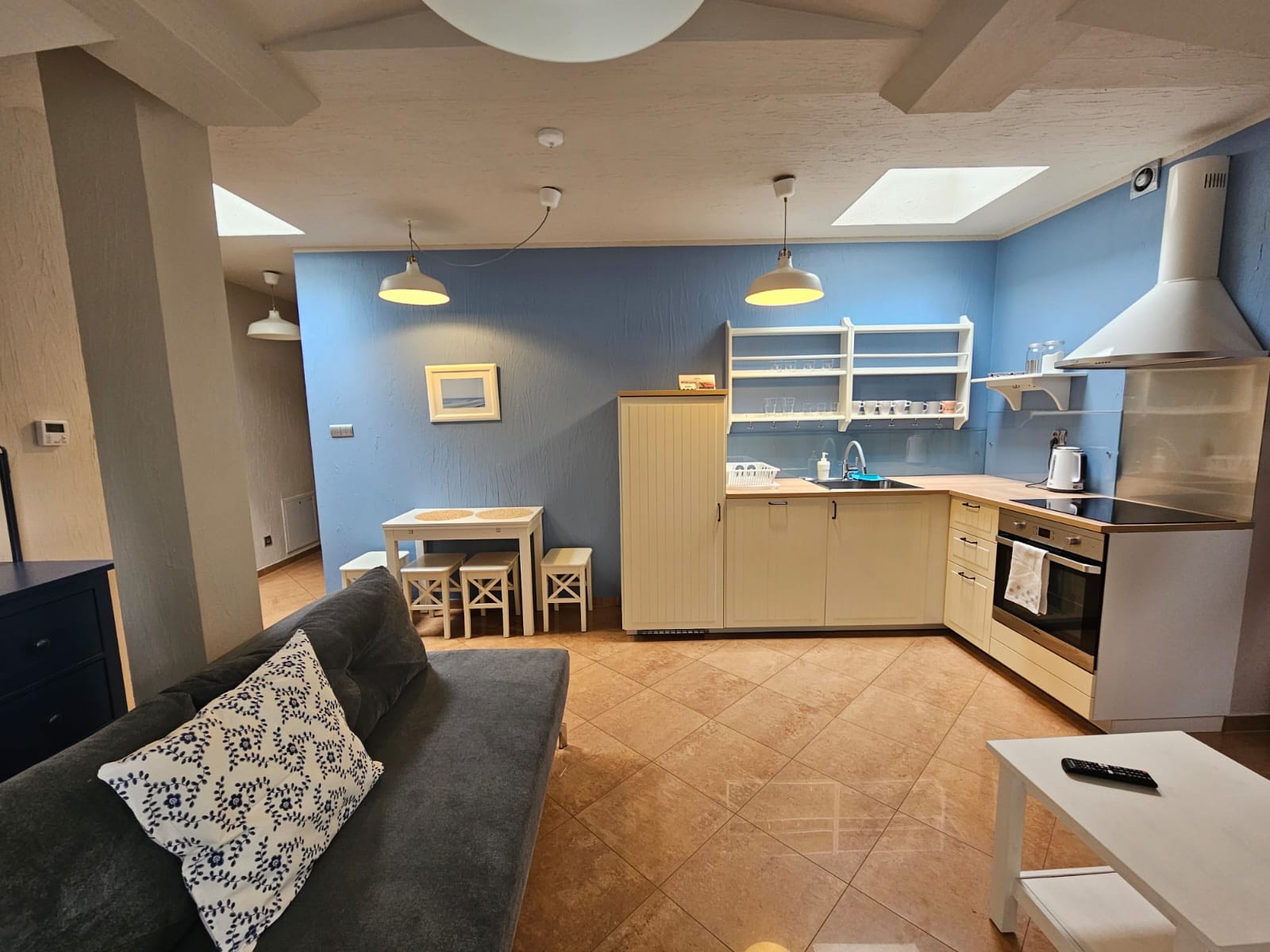 - jasnego salonu z aneksem kuchennym: tutaj możesz wypocząć na wygodnej sofie, delektując się widokiem z balkonu, obejrzeć telewizję lub przygotować smaczne posiłki w pełni wyposażonej kuchni;