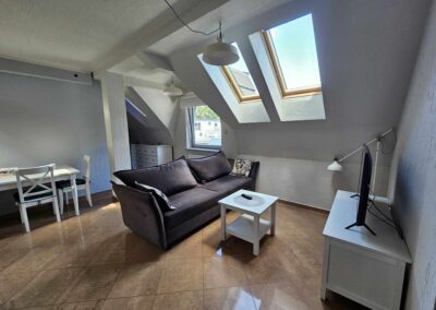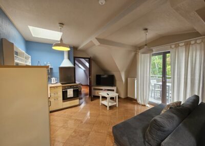 - Eleganckiego salonu z aneksem kuchennym: tutaj możesz wypocząć na wygodnej sofie, delektując się widokiem z balkonu, obejrzeć telewizję lub przygotować wyśmienite posiłki w nowoczesnej kuchni.