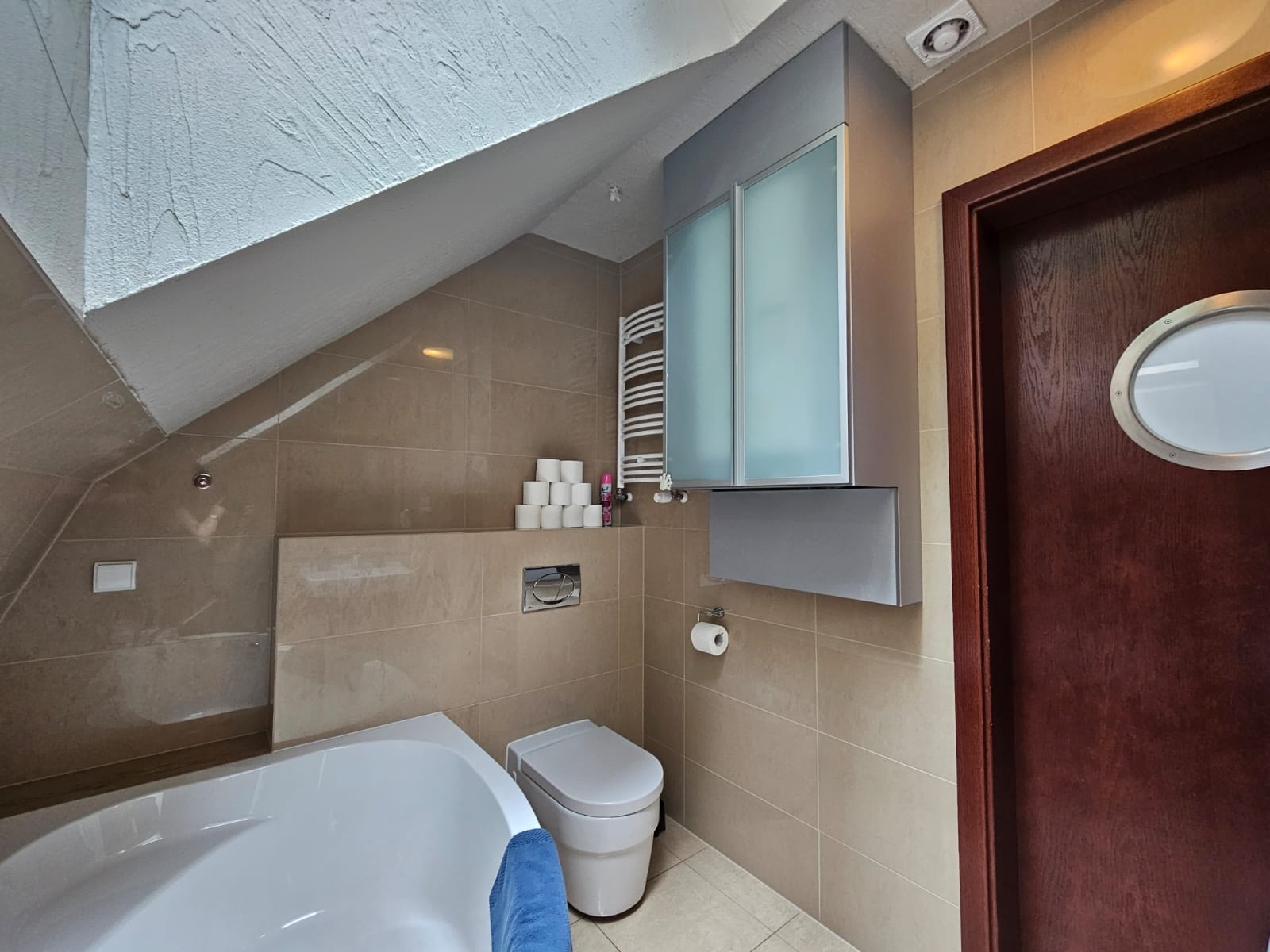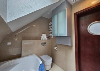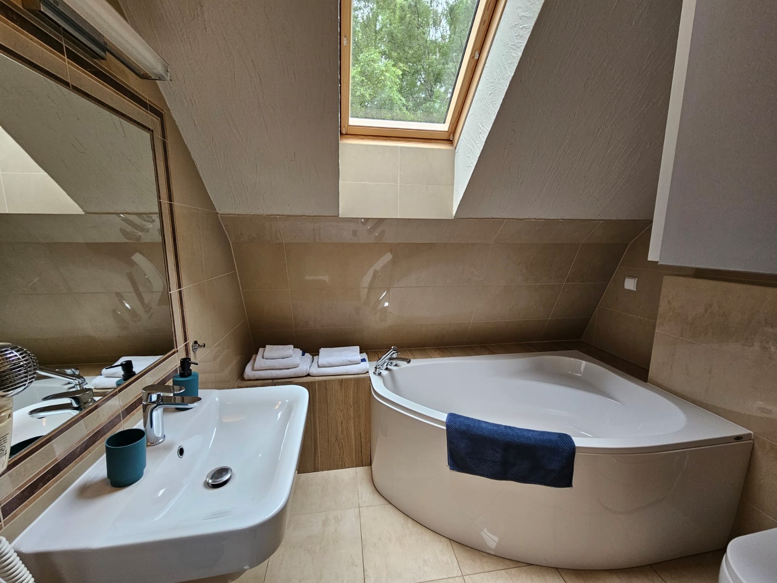 - Stylowej łazienki z wanną i toaletą: przestronna łazienka z wanną, miękkimi ręcznikami i luksusowymi kosmetykami zapewni Ci prawdziwe odprężenie i relaks.